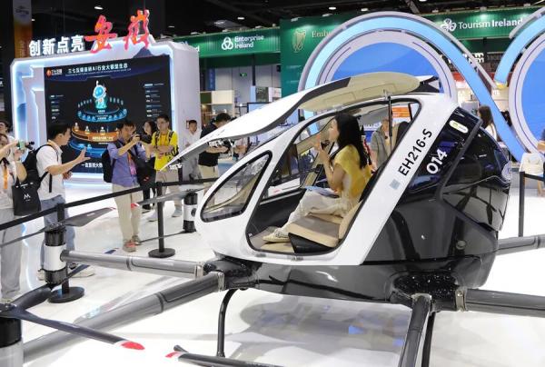 2025年9月10日,在2025年服贸会主题展展区,一名媒体人员(右)在主宾省安徽省展台体验了解无人驾驶载人电动垂直起降航空器。新华社记者 侯俊 摄
