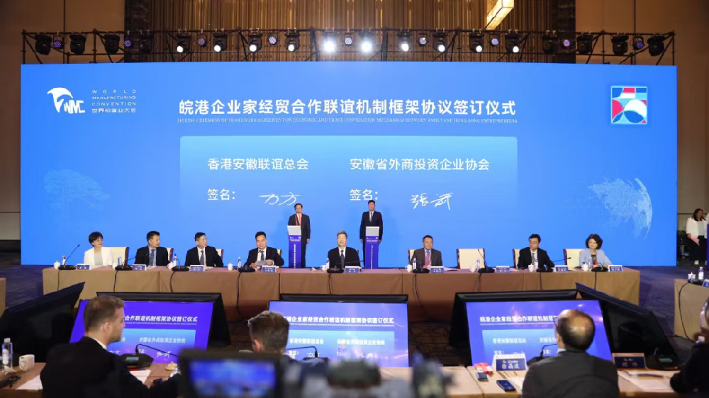 为推动皖港两地经济合作与高质量发展,共同开拓国际市场,围绕皖港两地经济社会高质量发展大局,团结凝聚皖港两地企业家,发挥桥梁纽带作用,积极搭建平台,促进两地企业家的交流合作,9月19日下午,安徽省外商投资企业协会会长张箭先生与香港安徽联谊总会会长方方先生在世界制造业大会-安徽省新兴产业与跨国公司对接会暨“徽动全球”合作伙伴交流会上,签订了“皖港企业家经贸合作联谊机制框架协议”。