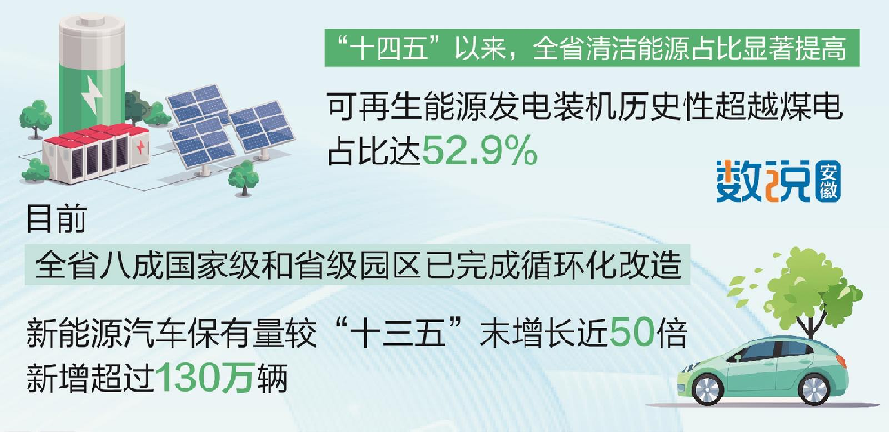 “十四五”以来,安徽坚定不移走生态优先、绿色低碳发展道路,大力推进传统产业高端化、智能化、绿色化升级,加快构建绿色低碳循环经济体系。全省清洁能源占比显著提高,可再生能源发电装机历史性超越煤电,占比达52.9%。目前,全省八成国家级和省级园区已完成循环化改造,合肥、芜湖绿色货运配送示范工程扎实推进。