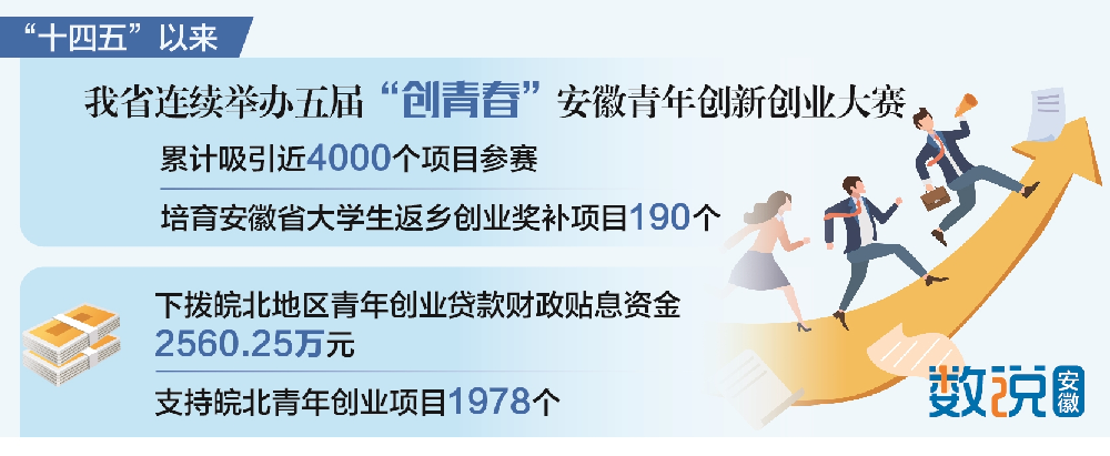 “十四五”以来,我省高度重视青年创新创业工作,青年创业活力持续迸发。连续举办五届“创青春”安徽青年创新创业大赛,设立科技创新、乡村振兴、数字经济、社会企业四个组别,累计吸引近4000个项目参赛;累计培育安徽省大学生返乡创业奖补项目190个,拨付奖补资金950万元;累计下拨皖北地区青年创业贷款财政贴息资金2560.25万元,支持皖北青年创业项目1978个。举办青年创业者培训交流等活动,连续开展两届“安徽省青年创业奖”评选,共评定“安徽省青年创业奖”20名。