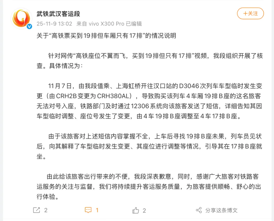 我们高兴地看到,武铁武汉客运段及时向这位网友表达了歉意。造成网友出行不便与心情不快的原因,大致也与上文所述相近。不过,铁路部门在情况说明中还特意指出,此前已通过12306系统向这位旅客发送了相关短信。