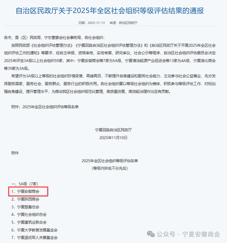 此次获评5A级,不仅是对宁夏安徽商会过往工作的高度总结与肯定,更是未来发展的全新起点。商会自成立以来,始终秉持着服务会员、服务社会、促进宁皖两地经济文化交流的宗旨,积极搭建平台,为会员企业提供各类资源对接、政策咨询等服务,助力会员企业不断发展壮大。同时,商会还积极投身公益事业,组织开展了众多扶贫济困、捐资助学等公益活动,为宁夏的社会发展贡献了重要力量。此次荣获5A级社会组织称号,将激励宁夏安徽商会在未来的发展中继续砥砺前行,不断提升自身服务能力和水平,为宁皖两地的协作发展书写更加绚丽的篇章。