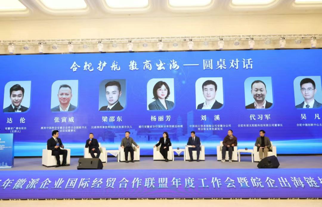 在圆桌对话环节,围绕“合规护航 徽商出海”,越南中国商会安徽企业联合会副秘书长、合肥一志创投董事长张寅威,汉盛律师事务所国际业务部合伙人、国际业务委员会秘书长梁邵东,建行安徽省分行国际业务部副总经理杨丽芳,中国出口信用保险公司安徽分公司项目险业务处副处长刘溪,合肥布诺太阳能科技有限公司董事长代习军,合肥中德创新中心主任吴凡共话各国产业风向与海外投资新蓝海。
