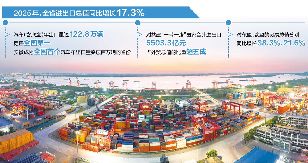 “不把鸡蛋放在同一个篮子里”已成为众多外贸企业的共识。2025年,安徽省对共建“一带一路”国家合计进出口5503.3亿元,占外贸总值的比重超五成。东盟、欧盟分别为安徽第一、第二贸易伙伴,2025年,安徽对东盟、欧盟的贸易总值分别同比增长38.3%、21.6%。