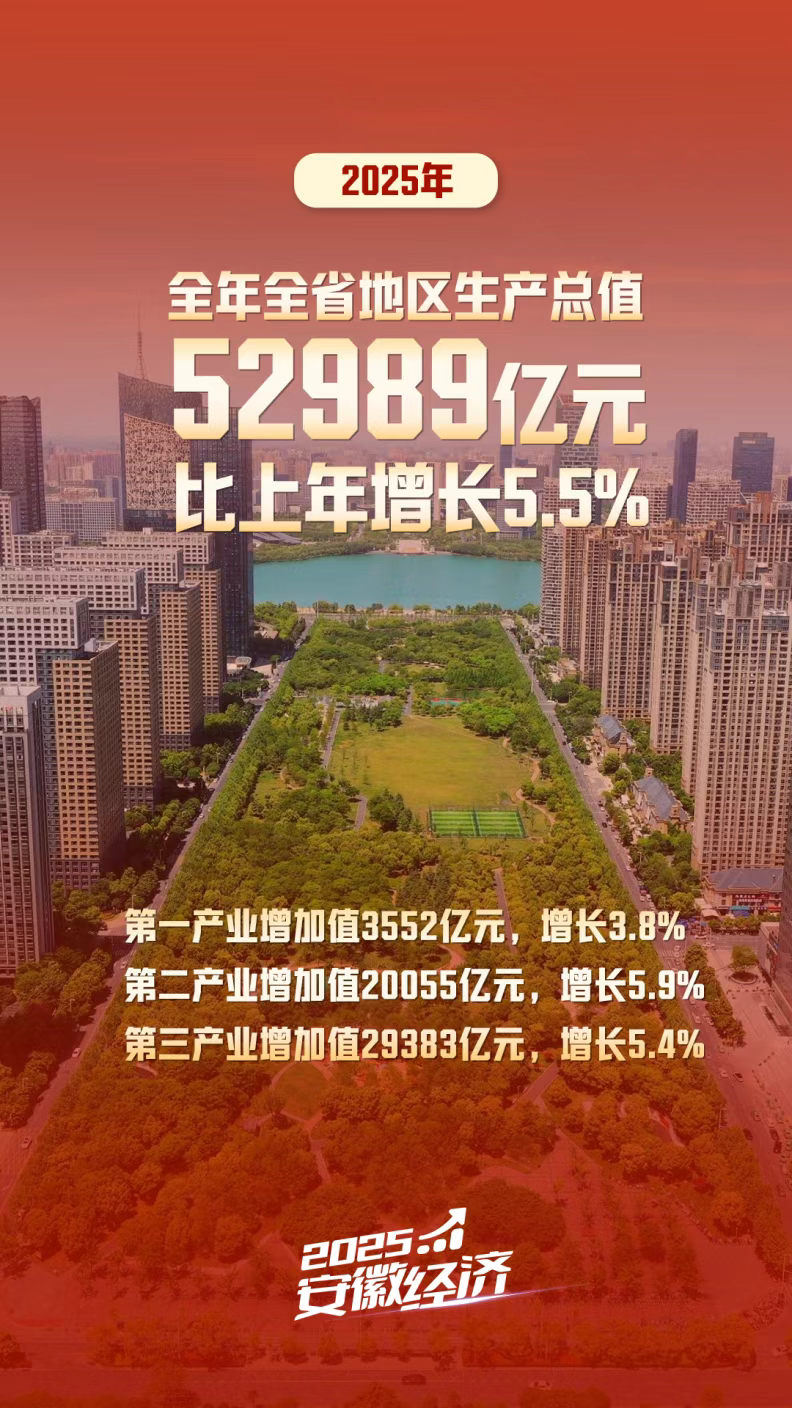 1月23日,《徽商》全媒体记者从2025年全省经济运行情况新闻发布会上获悉,根据地区生产总值统一核算结果,2025年安徽全省地区生产总值52989亿元,按不变价格计算,比上年增长5.5%。其中,第一产业增加值3552亿元,增长3.8%;第二产业增加值20055亿元,增长5.9%;第三产业增加值29383亿元,增长5.4%。
