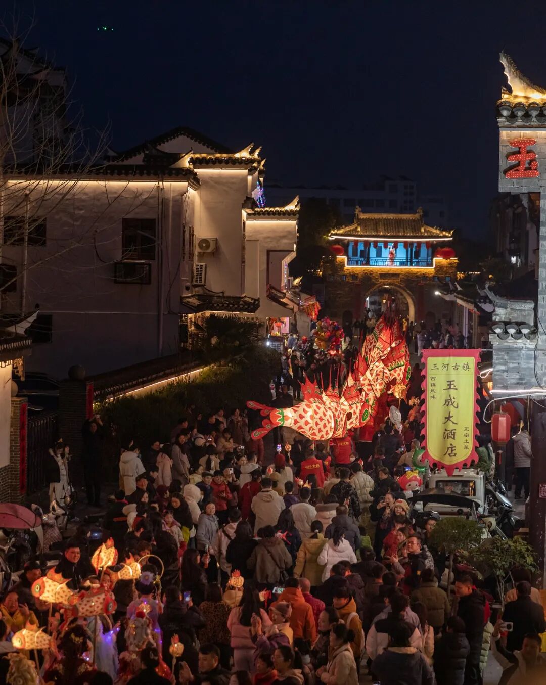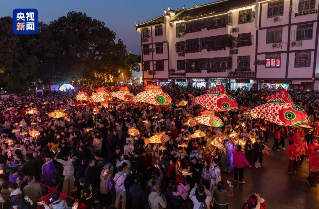 每天18时到21时,数百人甚至上千人的鱼灯巡游队伍会从三河古镇的万年台景点一起出发,经过古城墙、鑫樾阁、三县桥等核心景点,舞动着手工扎制的传统徽州鱼灯,穿行在古镇的街巷里。