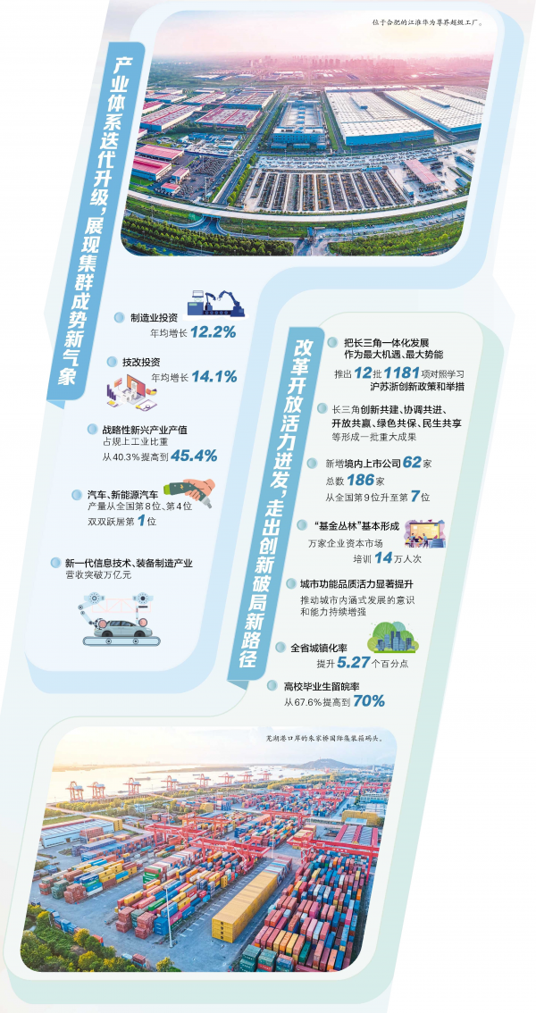 这是热度之变。这五年,安徽大力推动科技创新和产业创新深度融合,新质生产力加快成长,发展“热度”不断攀升。汽车产业“汽”势磅礴,光伏储能“光”彩照人,集成电路“芯”光灿烂,新型显示“屏”频出彩,量子信息前途无“量”……一批新兴产业发展动能强劲有力。其中,汽车产业实现历史性突破,汽车和新能源汽车产量从2020年的全国第8位、第4位双双跃升至2025年的全国第1位,全国每出口四辆汽车,就有一辆安徽造。