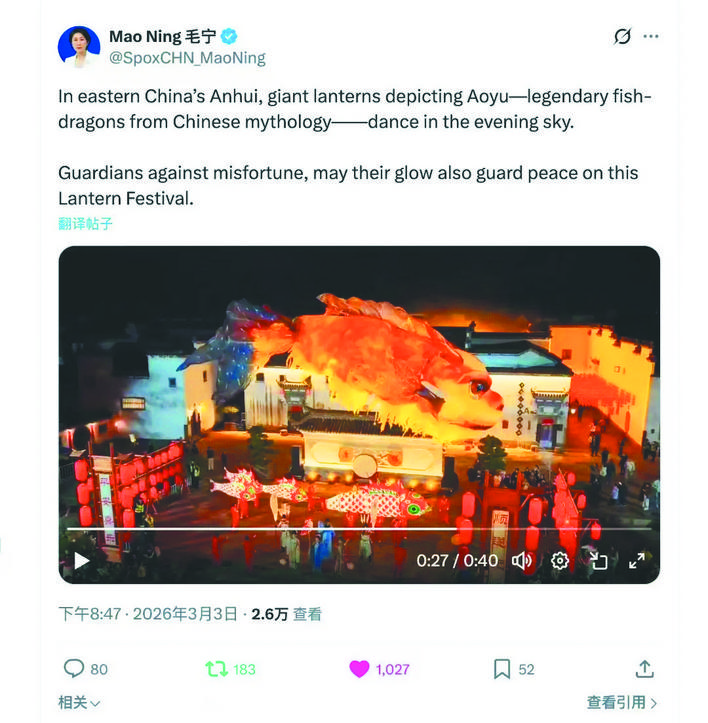 3月3日晚,外交部新闻司司长、发言人毛宁在海外社交平台发布了一段40秒的视频,向世界推介黄山市徽州区唐模景区“满池娇・独占鳌头”鱼灯巡游,让“满池娇”鳌鱼飞天惊艳亮相国际舞台。