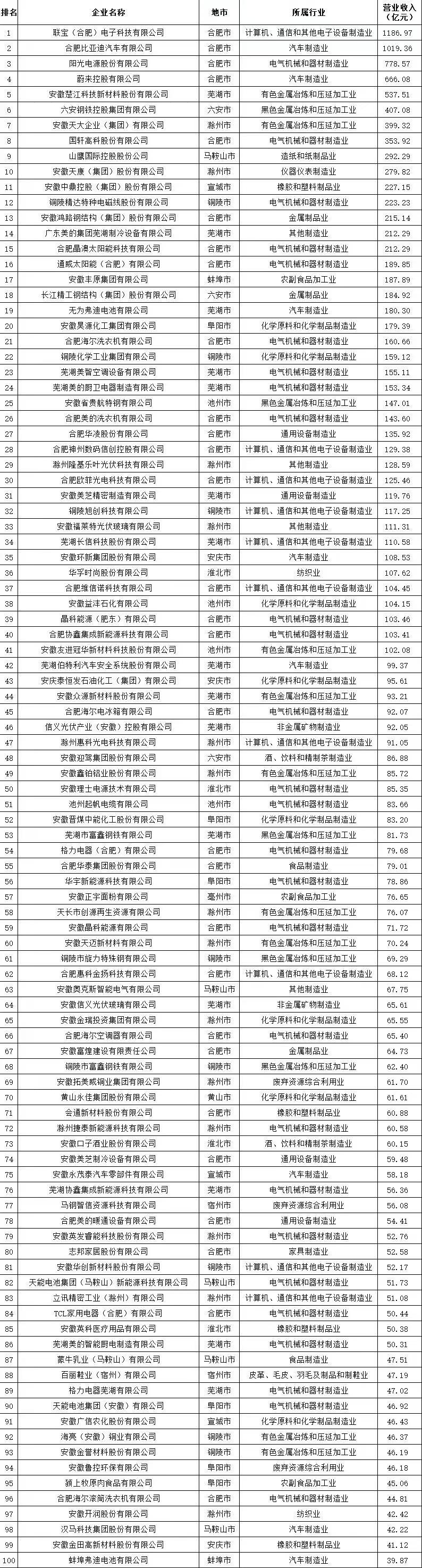 联宝(合肥)电子科技有限公司、合肥比亚迪汽车有限公司、阳光电源股份有限公司、蔚来控股有限公司、安徽楚江科技新材料股份有限公司位列安徽民营企业制造业百强前五。