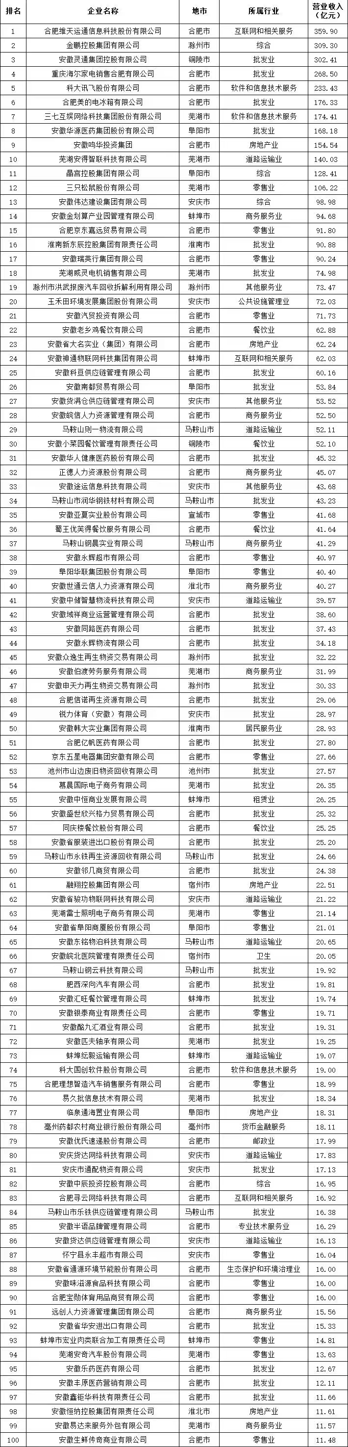 合肥维天运通信息科技股份有限公司、金鹏控股集团有限公司、安徽灵通集团控股有限公司、重庆海尔家电销售合肥有限公司、科大讯飞股份有限公司位列安徽民营企业服务业百强前五。