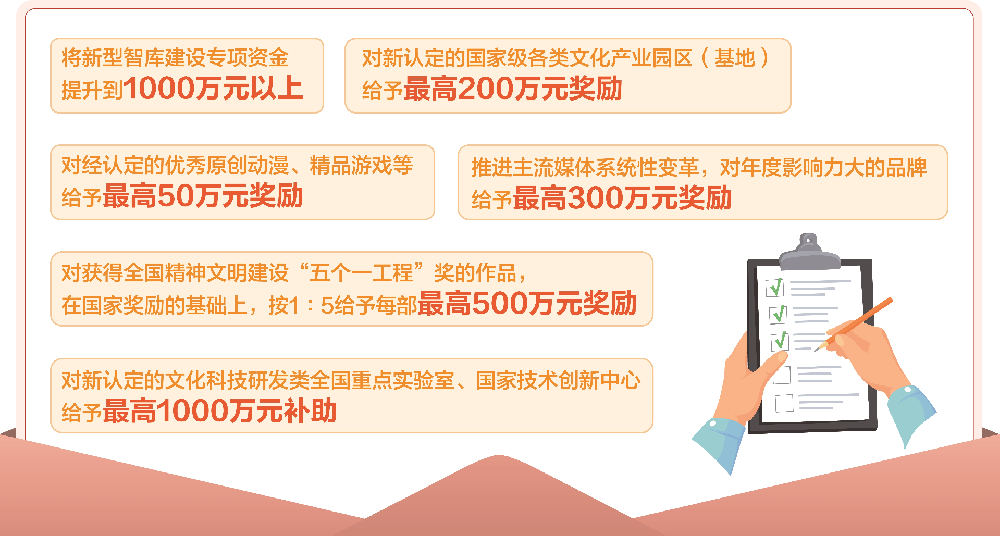 《若干举措》强化资金保障力度,调动社会力量参与文化建设:将新型智库建设专项资金提升到1000万元以上。支持紫云山(包河)文化创意产业园打造全国具有重要影响力的文化创意产业集聚地,对新认定的国家级各类文化产业园区(基地)给予最高200万元奖励。支持发展动漫、游戏、电竞、电音、网络文学、直播电商、数字创意、网络视听等新产业新业态,对经认定的优秀原创动漫、精品游戏等给予最高50万元奖励。推进主流媒体系统性变革,对年度影响力大的品牌,给予最高300万元奖励。对获得全国精神文明建设“五个一工程”奖的作品,在国家奖励的基础上,按1∶5给予每部最高500万元奖励。对新认定的文化科技研发类全国重点实验室、国家技术创新中心,给予最高1000万元补助。