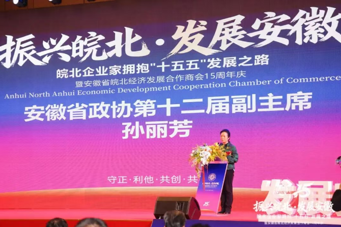 随后,省政协第十二届副主席孙丽芳指出,皖北振兴是省委、省政府的重大战略部署,安徽省皖北经济发展合作商会十五年来始终与皖北发展同频共振、与会员企业同心同行,在政企对接、招商引资、企业赋能、公益慈善等方面做了大量卓有成效的工作,为皖北经济社会发展作出了积极贡献。希望商会以十五周年庆为新的起点,进一步凝聚企业家共识,传承徽商精神,聚焦皖北振兴重点任务,搭建更广阔的合作平台,引导更多企业家扎根皖北、投资皖北、建设皖北,助力皖北区域优势转化为发展胜势,为“振兴皖北、发展安徽”贡献更大力量。