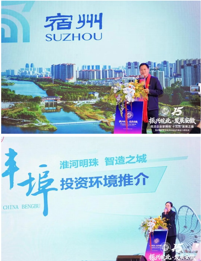 在城市推介环节,宿州市投资促进中心和蚌埠市招商和对外合作中心负责人全面展示了两地在区位、产业、发展机遇及营商环境等方面的优势,并向广大企业家发出诚挚的投资邀约。