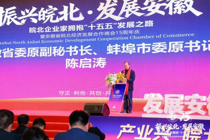 省委原副秘书长、蚌埠市委原书记陈启涛表示,十五年来,商会扎根皖北,助力皖北振兴转型,已成为皖北高质量发展的重要力量、政企与区域协同的关键纽带。针对“十五五”皖北发展,陈启涛提出三点建议:一是推动创新链产业链深度融合,赋能皖北产业升级;二是推动政策红利精准落地,惠及皖北企业发展;三是强化区域协同抱团发展,打响皖北产业品牌。陈启涛强调,省委、省政府对皖北振兴和企业发展支持力度不断增强,希望商会以“十五五”为契机,坚守初心,带领会员企业为皖北振兴、安徽高质量发展贡献力量,恭祝庆典圆满成功,祝各位新春愉快、事业兴旺、再创辉煌。 大会期间,安徽省皖北经济发展合作商会常务副会长门振君发布商会五年发展规划报告,并提出构建3.0版商会平台,实现从联谊互动、合作赋能到战略共创的跨越,为商会高质量发展奠定基础。
