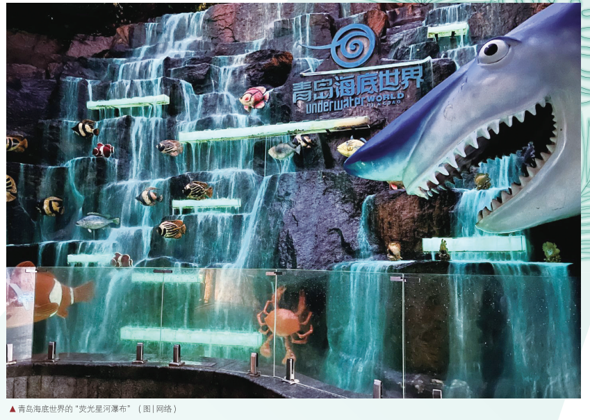 近日,青岛海底世界的一场“荧光星河瀑布”颠覆了传统文旅业态。高达9.5米、宽逾10米的瀑布倾泻而下,无数发光微生物随水流奔腾,在夜色中的崖壁成功勾勒出壮观的绿色星河。