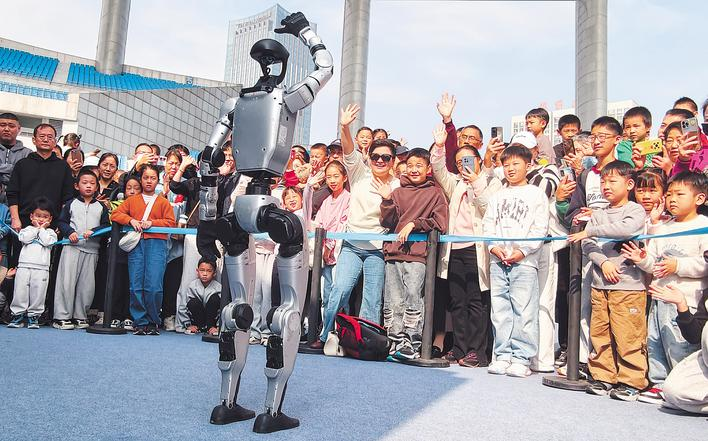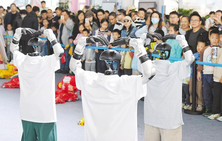 市民与作舞蹈表演的机器人互动。 记者 李亚朝 摄
