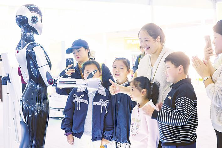 市民正与一款导览机器人零距离互动。 记者 李亚朝 摄