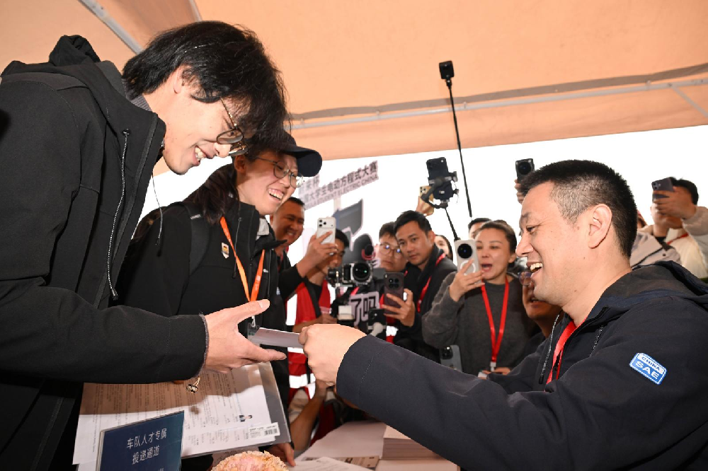 11月23日,在2025“蔚来杯”中国大学生电动方程式大赛暨中国大学生无人驾驶方程式大赛的比赛间隙,蔚来创始人、董事长、CEO李斌正在现场揽才,为大学生送上就业直通卡。
