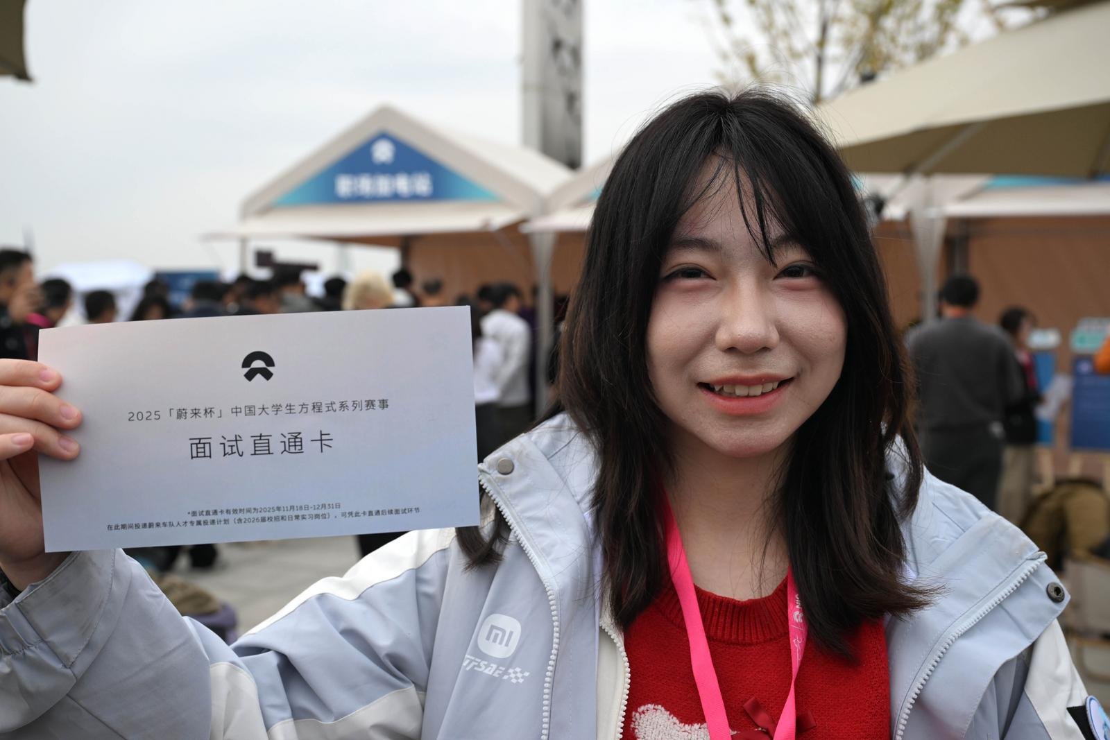 11月23日,来自北京理工大学纯电动方程式赛车队的大三学生、车队经理张新妍顺利通过面试,正在展示直通卡。