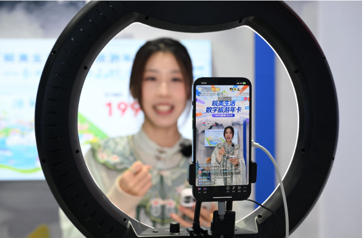11月20日,在第六届长三角文博会安徽展区,一位主播正在向网友介绍“皖美生活”数字旅游年卡。