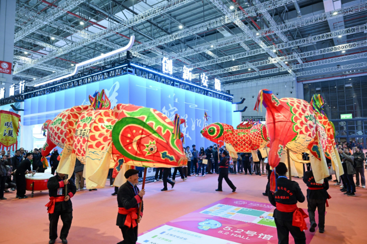 11月20日,在第六届长三角文博会安徽展区,来自黄山歙县的瞻淇鱼灯表演吸引众多观众。