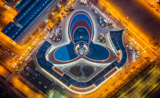 作为合肥分会场的核心载体,“皖美之瞳”主舞台的设计本身就是科创精神的表达。空中俯瞰如慧眼凝视未来,舞台中心“三足鼎立”的结构,呼应着量子信息、聚变能源、深空探测三大高地;周边61根融入马头墙元素的灯柱,则象征着合肥61所高校的智力支撑。