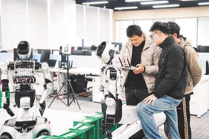 2月26日,在合肥乐聚机器人技术有限公司,研发人员调试工业智能机器人。新华社记者 杜宇 摄