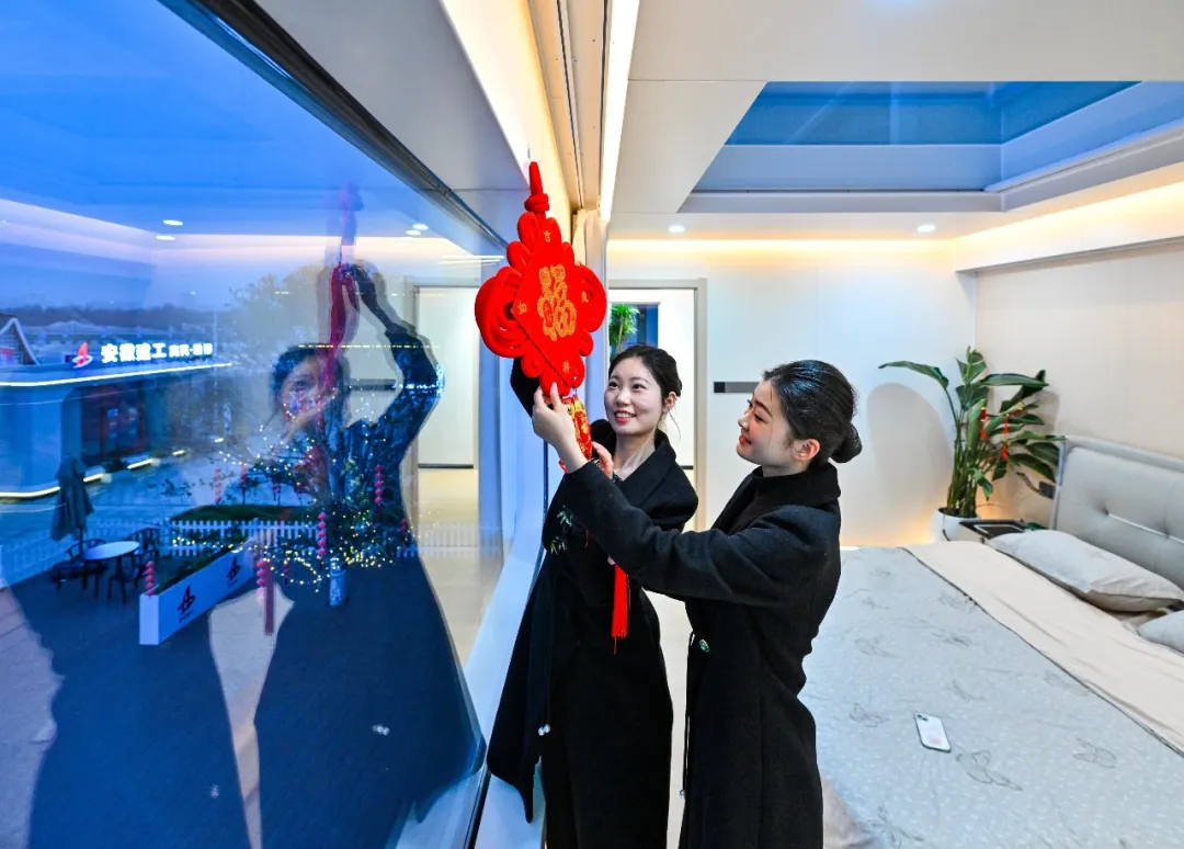 3月26日,位于合肥骆岗公园的“皖好房”科技展,工作人员在装饰适配文旅场景的科居云舱。
