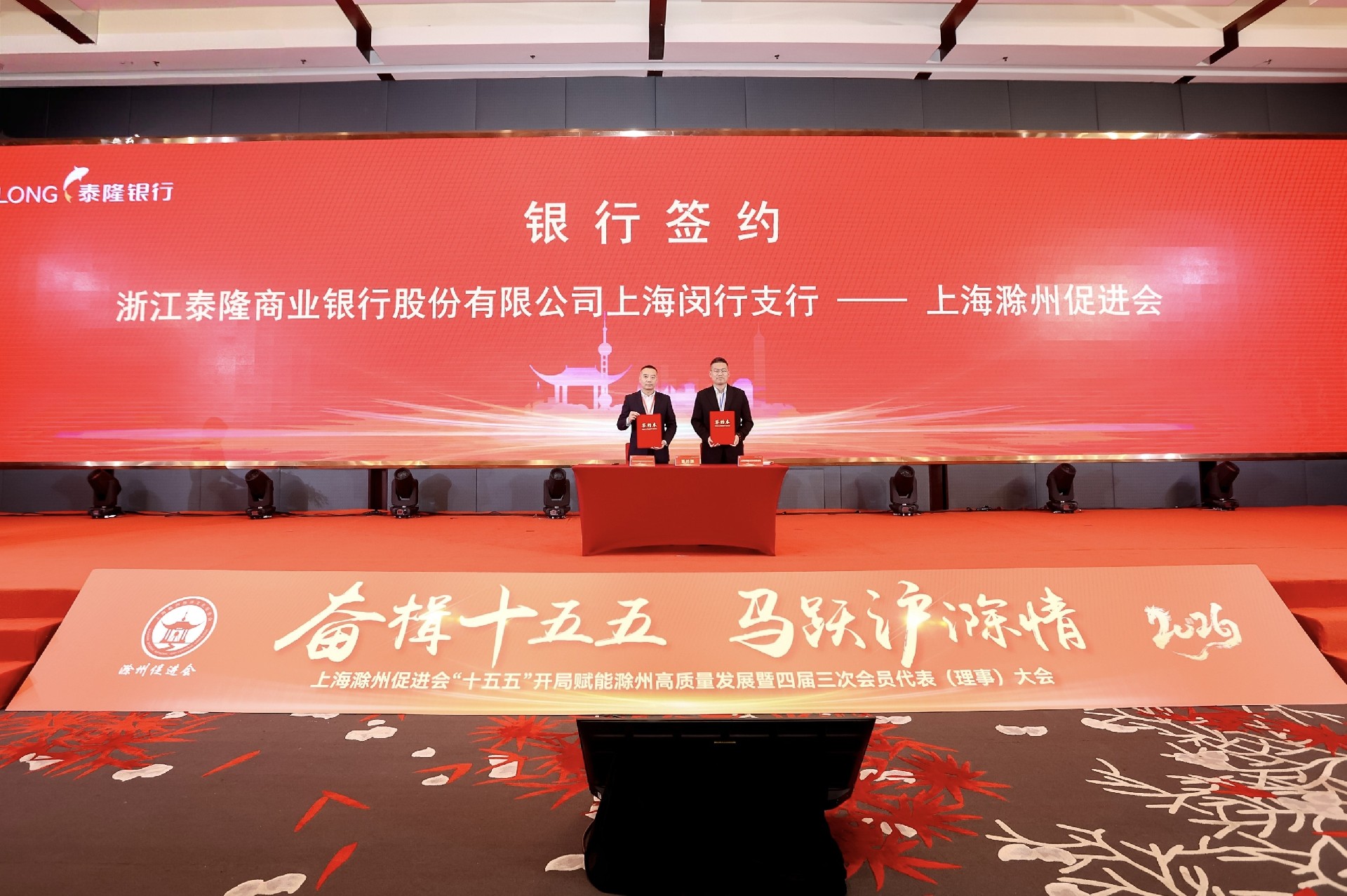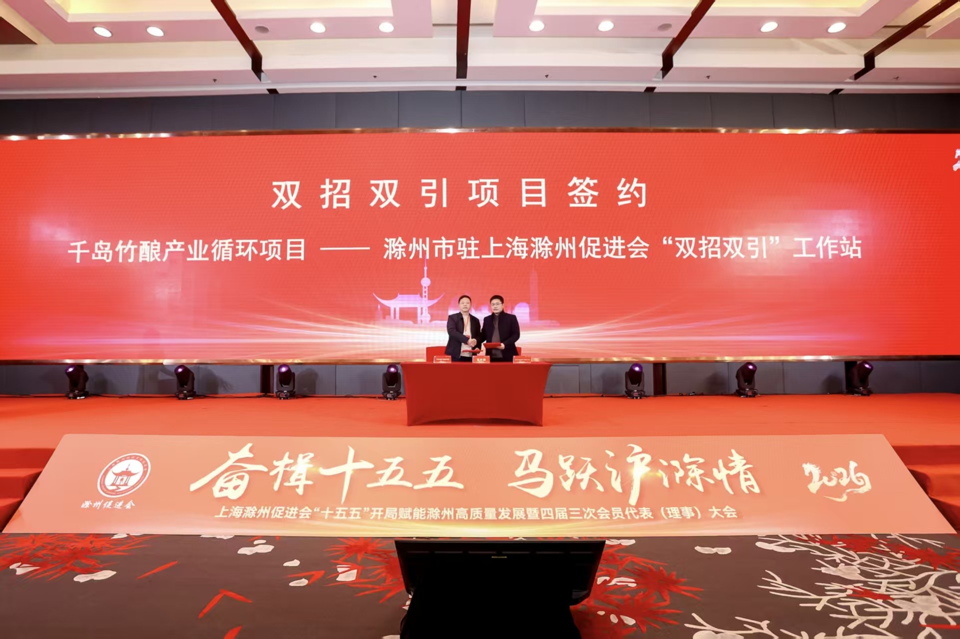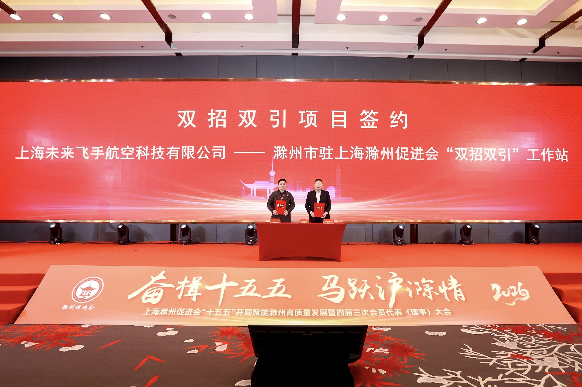 在双招双引项目签约环节,滁州市驻上海滁州促进会“双招双引”工作站分别与上海未来飞手航空科技有限公司、千岛竹酿产业循环项目成功签约,一批优质项目正式落地,为滁州“十五五”高质量发展注入新动能。随后,浙江泰隆商业银行股份有限公司上海闵行支行与上海滁州促进会签署战略合作协议,为在沪滁商返乡投资提供坚实金融支撑。