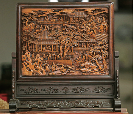 “这件座屏虽然尺寸不大,但用料、雕工和题材可算是同类作品中的‘顶流’。”周传新介绍,该藏品具有典型的嘉定木雕流派风格特征。