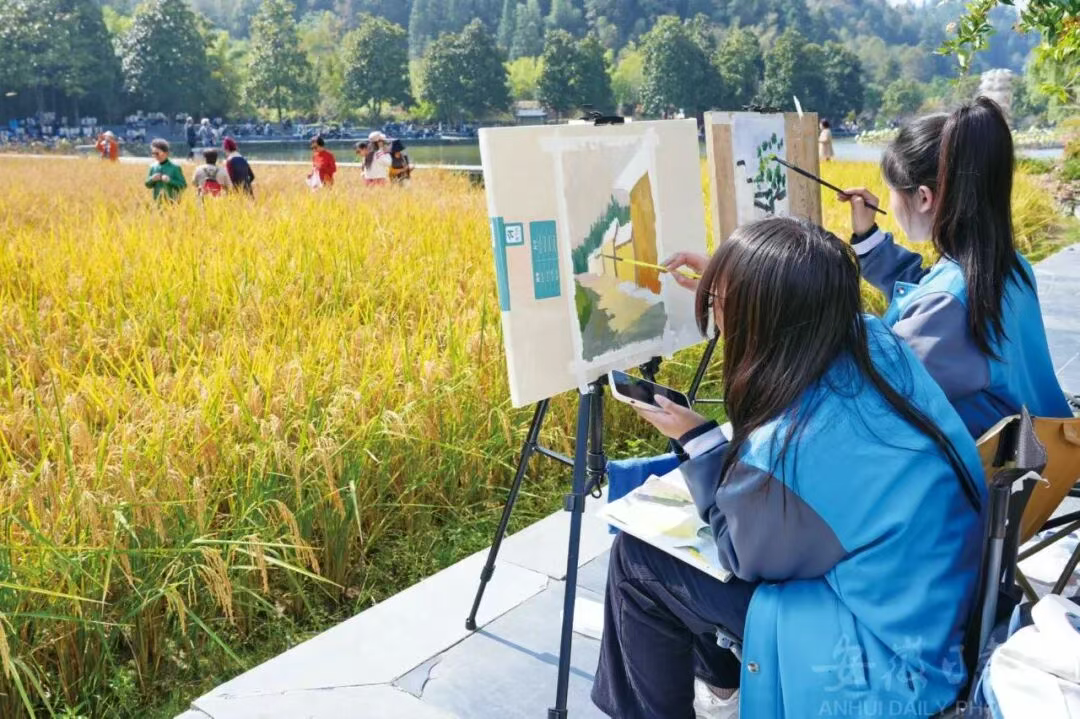 在黟县西递村,来自全国各地的美术生在用手中的画笔描绘金秋丰收美景