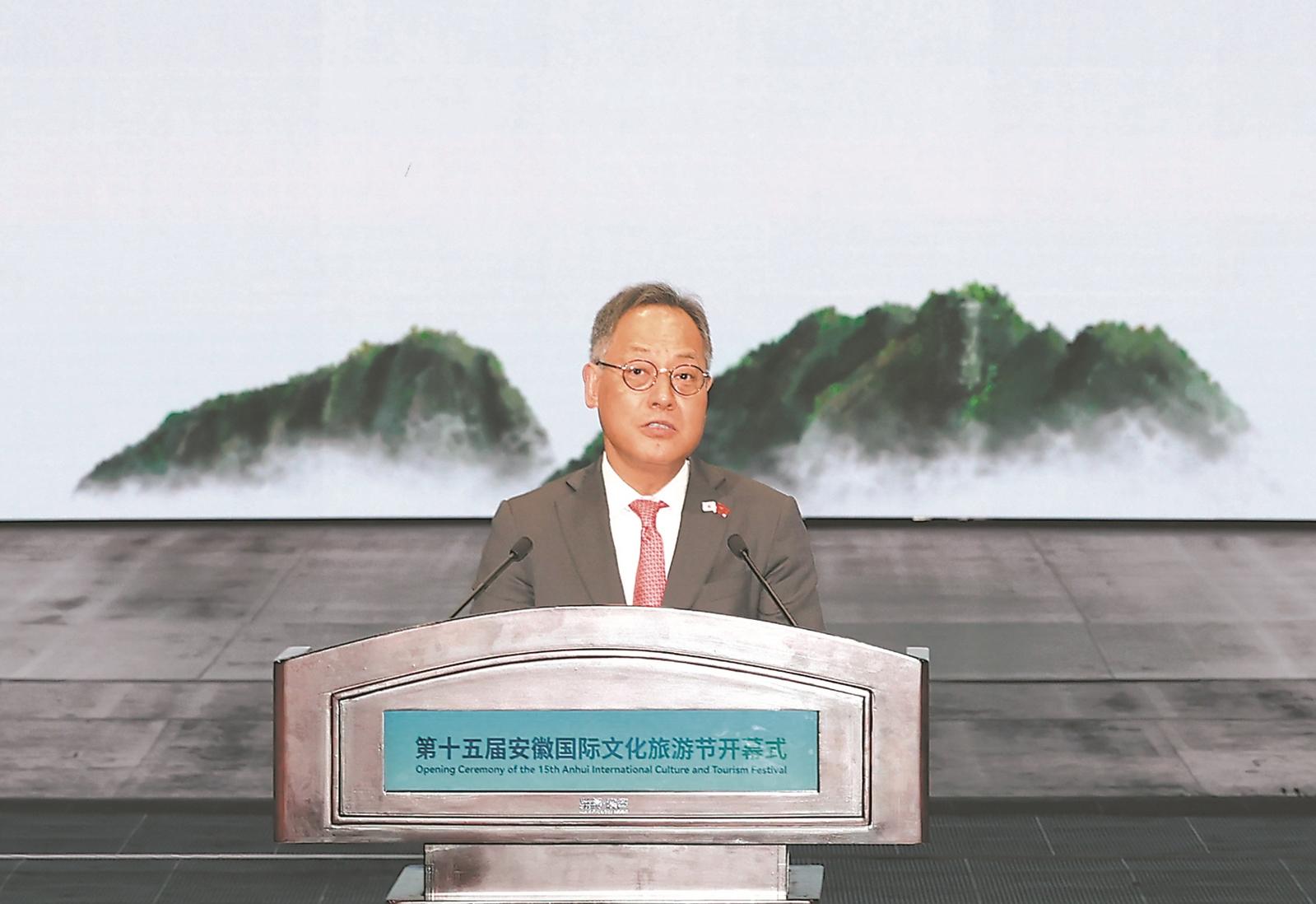 值此第十五届安徽国际文化旅游节隆重开幕之际,我谨表示热烈的祝贺。安徽国际文化旅游节已成为亚洲地区文化与旅游领域重要的交流合作平台。很高兴韩国受邀成为本届安徽国际文化旅游节的主宾国,对于能在这一具有特殊意义的场合代表韩国政府出席并致辞,我深感荣幸。