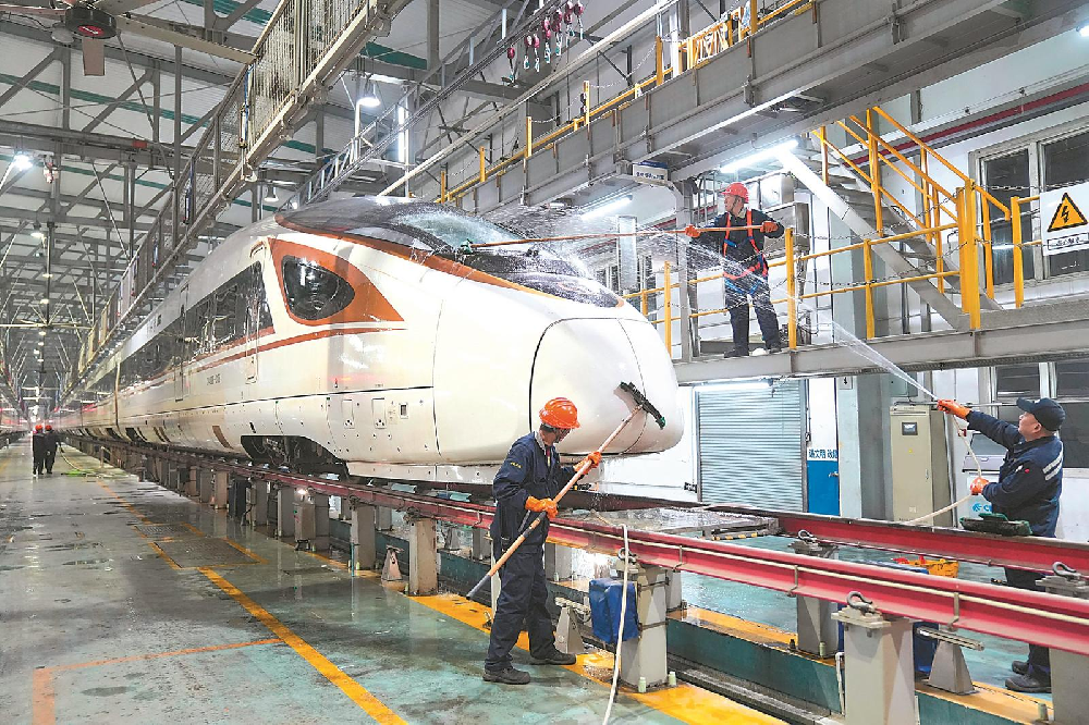 1月28日凌晨,合肥南动车运用所内,工作人员正在擦洗机车,为2月2日开始至3月13日结束的春运做好准备。记者 李博 实习生 张轻扬 摄