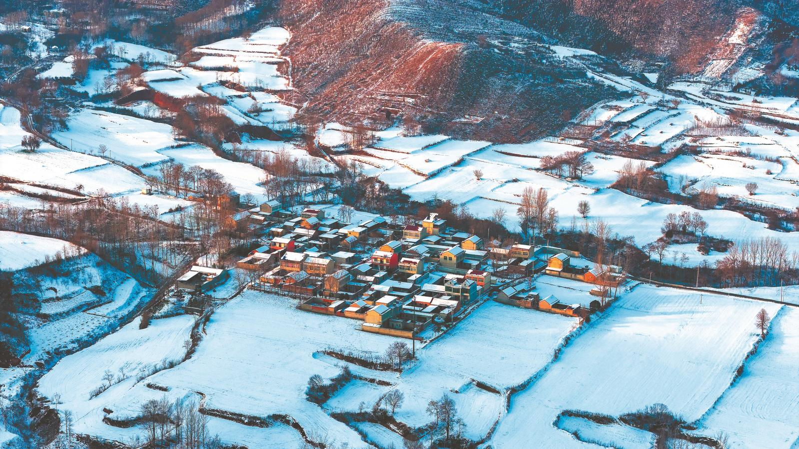 近日,航拍位于宿州市埇桥区符离镇的小山村。当日雪后初晴,远山与错落有致的民居、银装素裹的田野相互映衬,构成一幅美丽的乡村冬景图。通讯员 张伟 摄