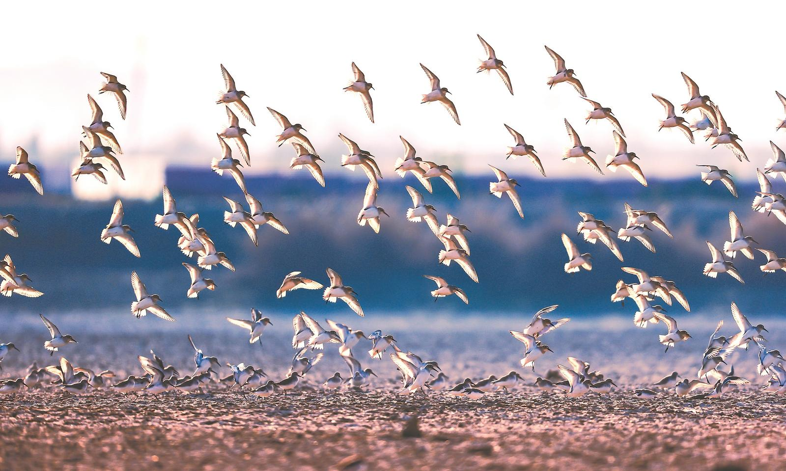 近日,合肥肥西三河国家湿地公园成群的黑腹滨鹬。通讯员 刘鸿宾 摄