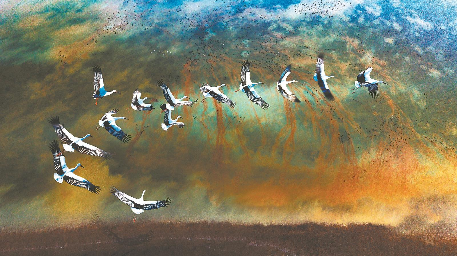 近日,池州升金湖湿地,成群东方白鹳在湖面上空翩跹起舞。通讯员 杨科甲 摄