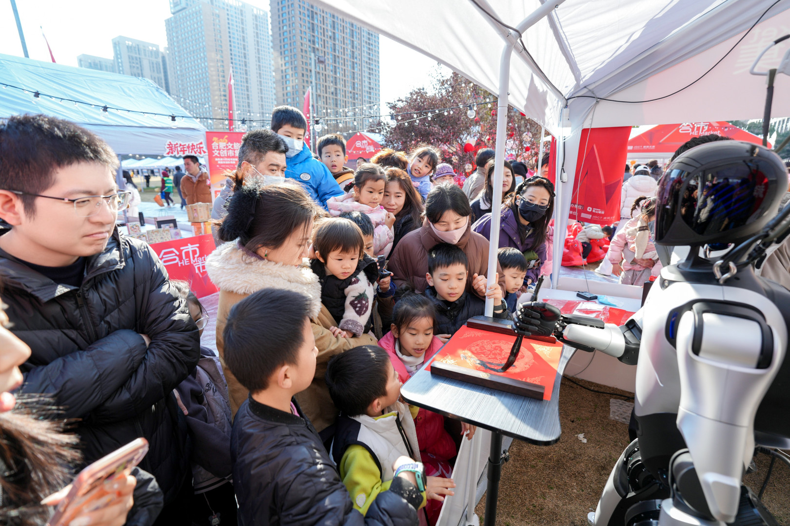 活动现场,游人熙熙攘攘,热闹非凡。80顶白色帐篷别出心裁地排列成“合肥”二字,成为又一网红打卡点;机器人“远征”手握毛笔,挥毫书写“福”字,吸引路人驻足围观;还有“五路财神”穿梭于人群之中,向大家派发祝福。