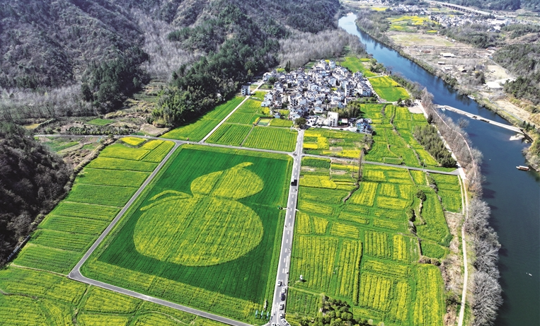 3月14日,休宁县齐云山镇南坑村油菜花竞相绽放,与粉墙黛瓦的徽派民居交相辉映,吸引众多游客前来打卡,共赴一场春日之约。