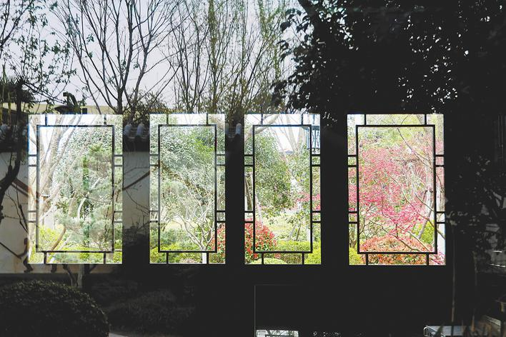 位于闹市的逍遥津,倒自有一份闲情雅致。粉樱轻倚木窗,透过石框门洞望去,湖石与垂柳静静伫立。圆纹漏窗将竹影筛成细腻的纹理,为白墙黛瓦平添了几分层次。